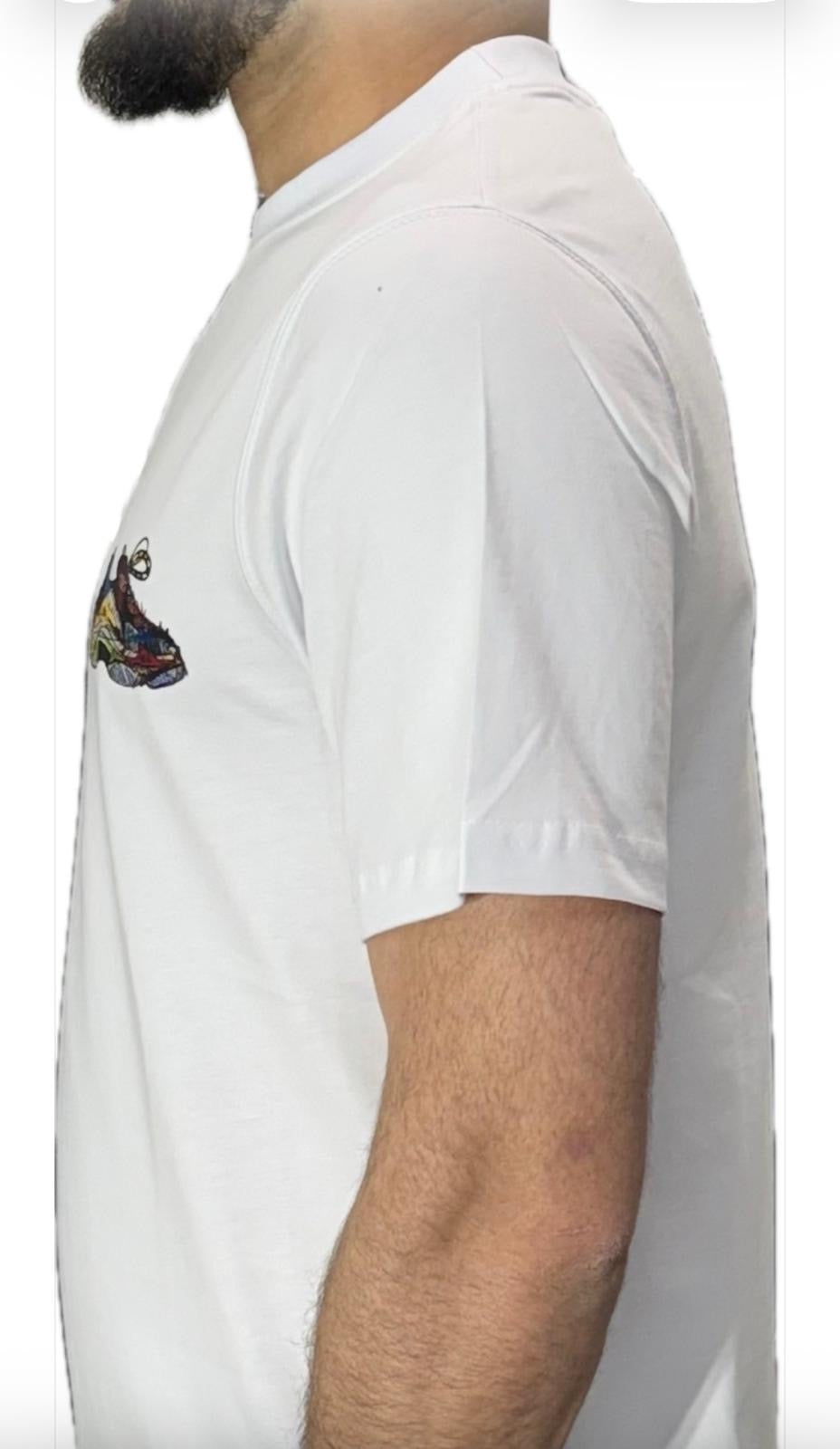 Geef je outfit een moderne en creatieve twist met dit stijlvolle witte T-shirt. Het shirt is voorzien van een opvallende, kleurrijke sneakerprint op de borst, geïnspireerd op street art en urban fashion. De subtiele print op de rug zorgt voor een extra detail zonder te overheersen.
